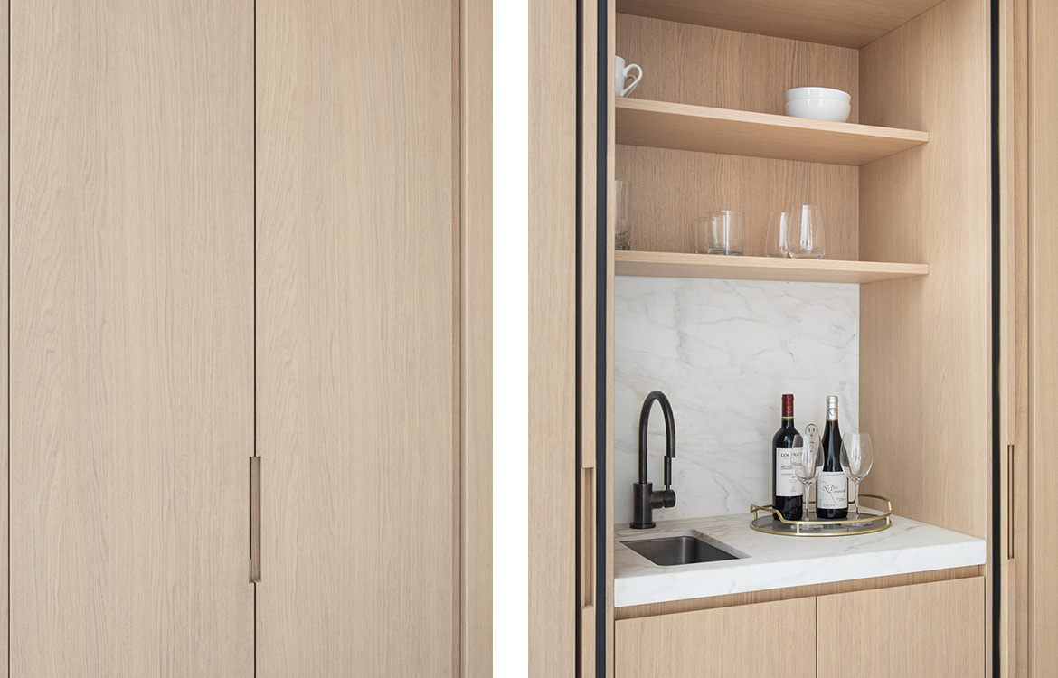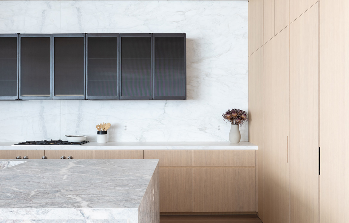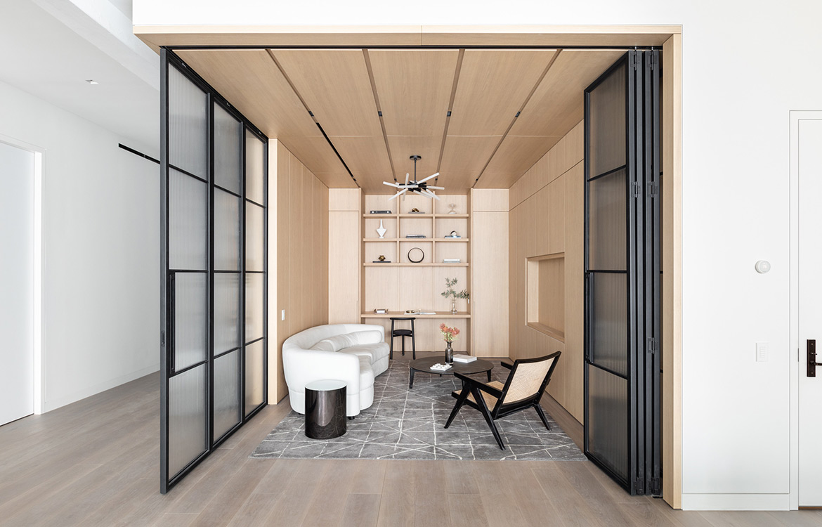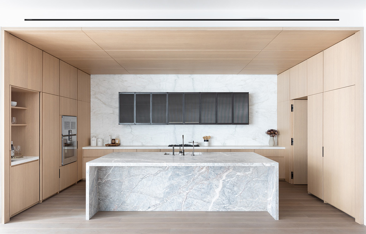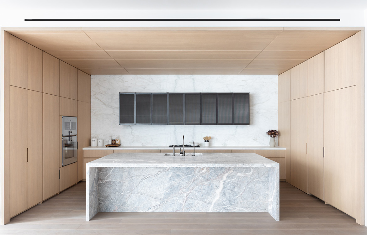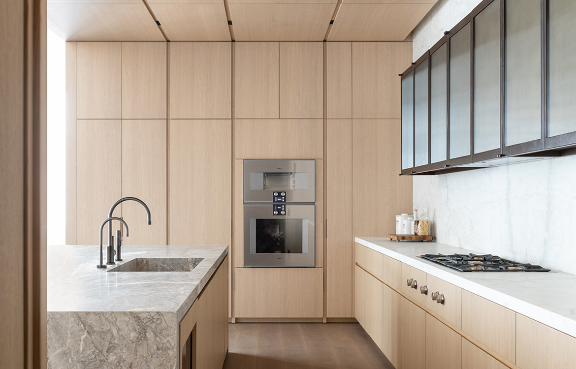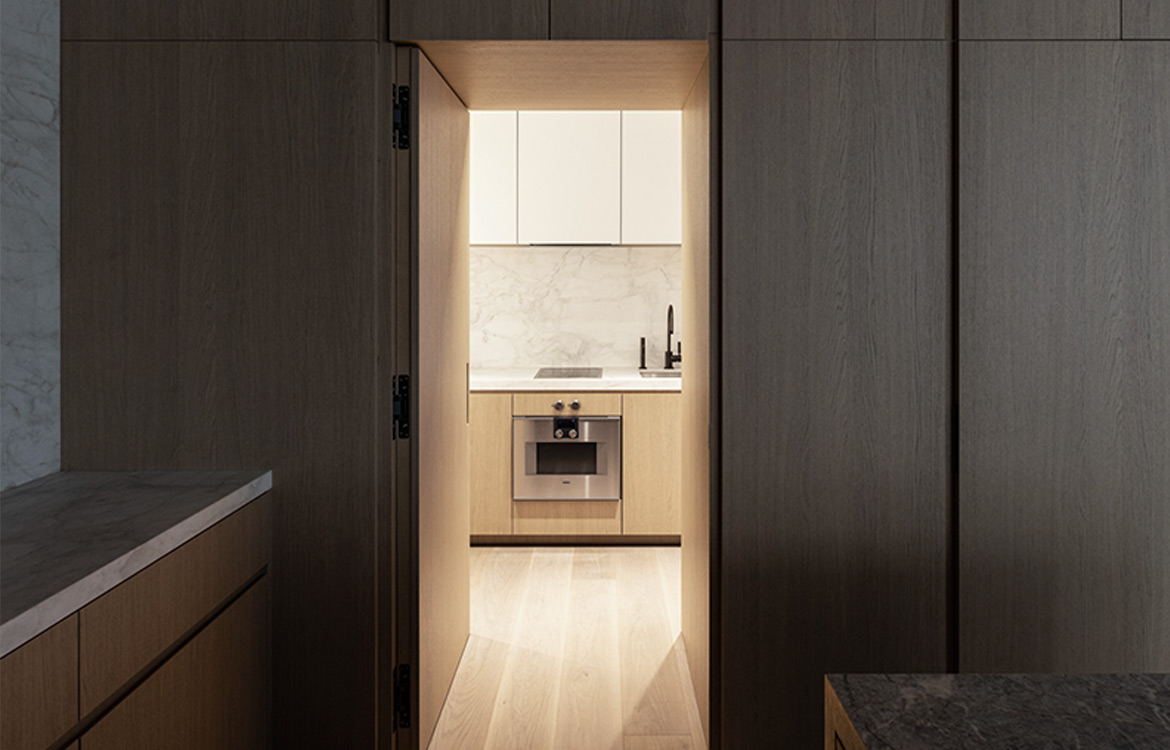 49 Greene stands among landmarked, turn-of-the-century buildings in the heart of Soho. The building features three full floors of 3,500 SF condominiums and a two-story 7,735 SF Penthouse unit. The dramatic great room boasts ceilings up to 13 feet with architectural steel columns, six oversized, east-facing windows offer classic SoHo streetscape views and flood the space with natural light. Floors 2-4 have tailor-made oak kitchens with 10’ islands with Fiore di Pesco marble countertops. Backsplash and countertop at wall units are in Calacatta stone. The impeccably designed chef’s kitchen is outfitted with a full suite of paneled Gaggenau appliances and a pull-out pantry. A scullery, concealed by a Canova custom magnetic closing door provides an additional induction cooktop, dishwasher, microwave, and sink, creating an ideal setup for anyone that enjoys entertaining. A custom den in the same oak finish is the centerpiece of each unit with millwork lined interiors and folding steel and glass doors.