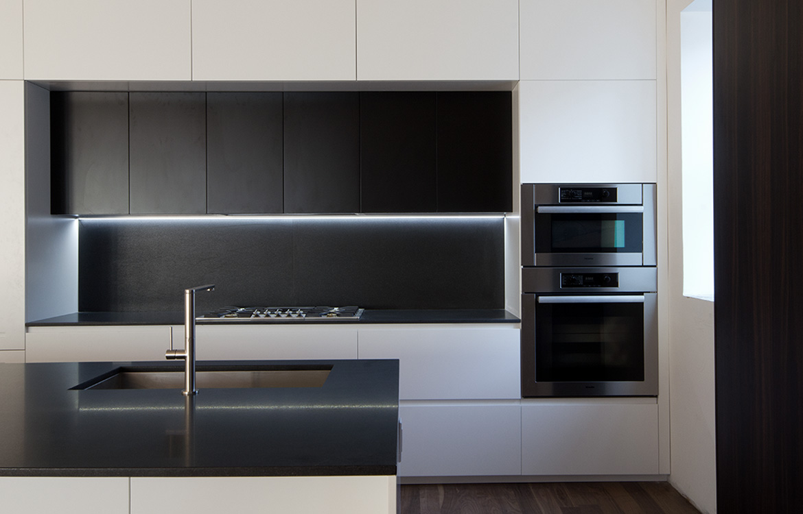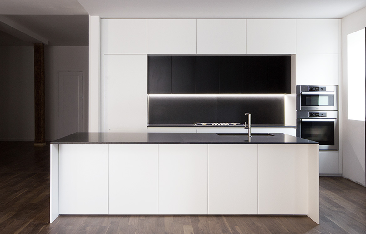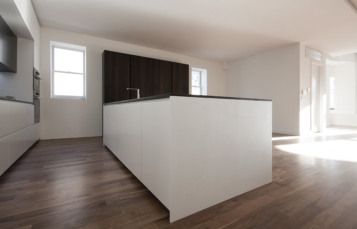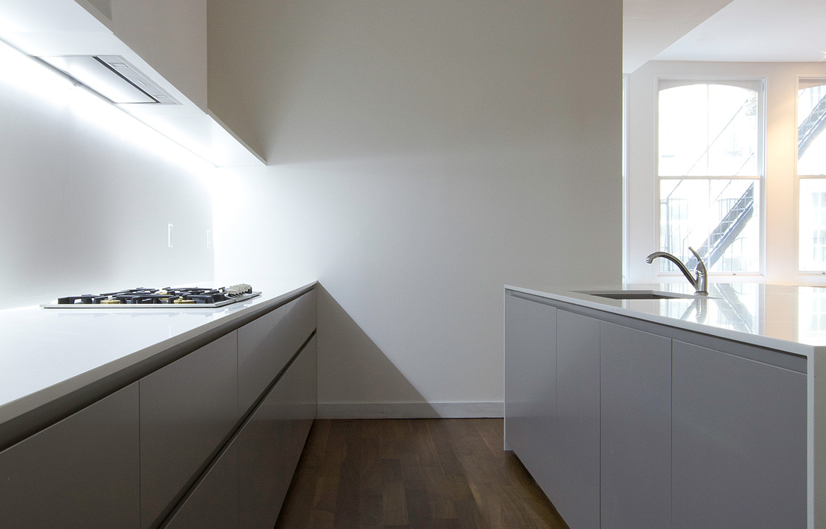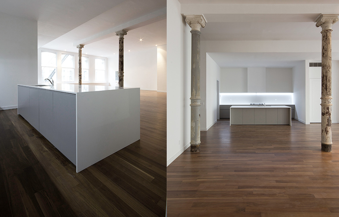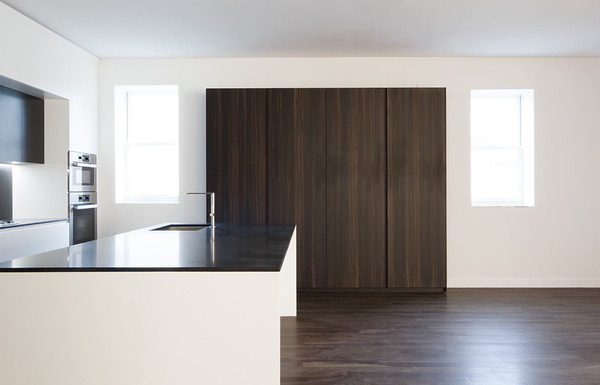 Este edificio tipo loft estilo boutique de hierro fundido del siglo XIX contiene cinco lofts residenciales nuevos de piso completo de 50 pies de ancho en el histórico distrito de fachadas de hierro fundido de TriBeCa. Las unidades cuentan con ventanas de gran tamaño, techos de 11′-14′, columnas y vigas de madera originales y de primera línea. Las cocinas italianas Canova son una obra maestra del diseño y la fabricación contemporánea, con líneas elegantes y puras, acabados en roble pintado en blanco y negro, bordes en inglete y gabinetes sin manijas.