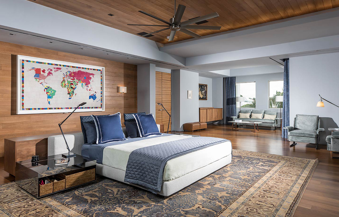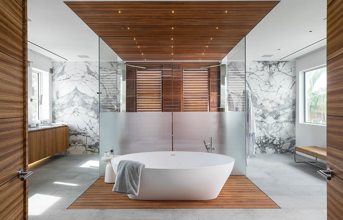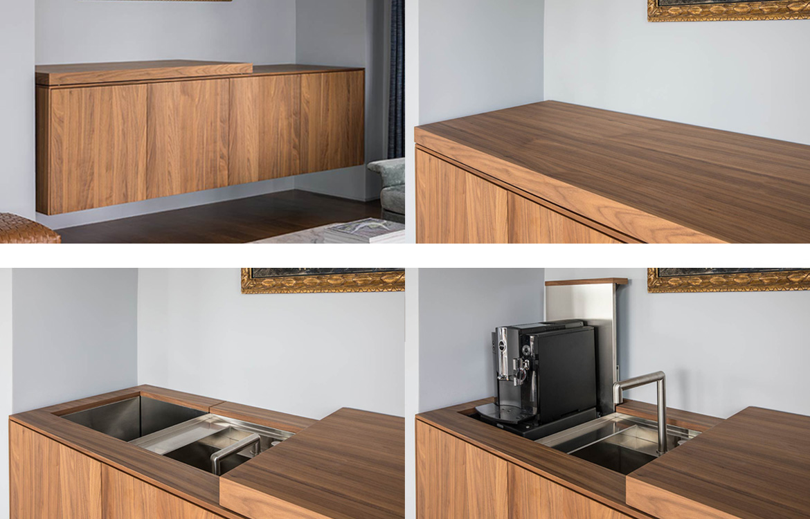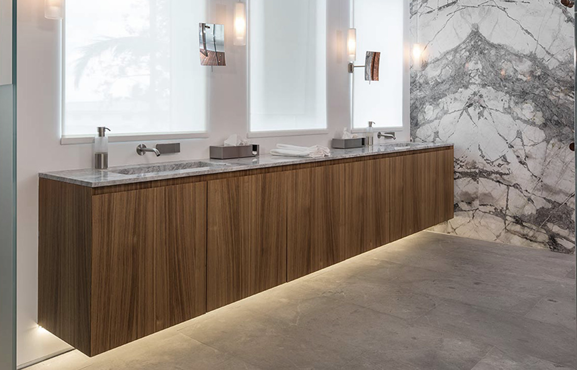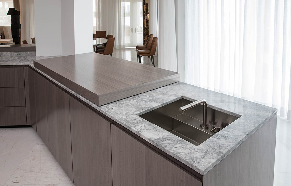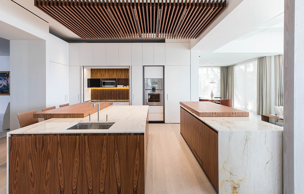 For the renovation of this seafront villa in Florida, Canova made elegant custom kitchens with top and sliding countertop in precious rosewood veneer finish, tall units with retractable doors in white matte lacquer, bathrooms cabinets in teak, a master bedroom coffee station with sliding top in walnut and an under lit bar in painted eucalyptus. Contemporary plumbing fixtures in marine grade stainless steel by CEA Design distributed by Canova.