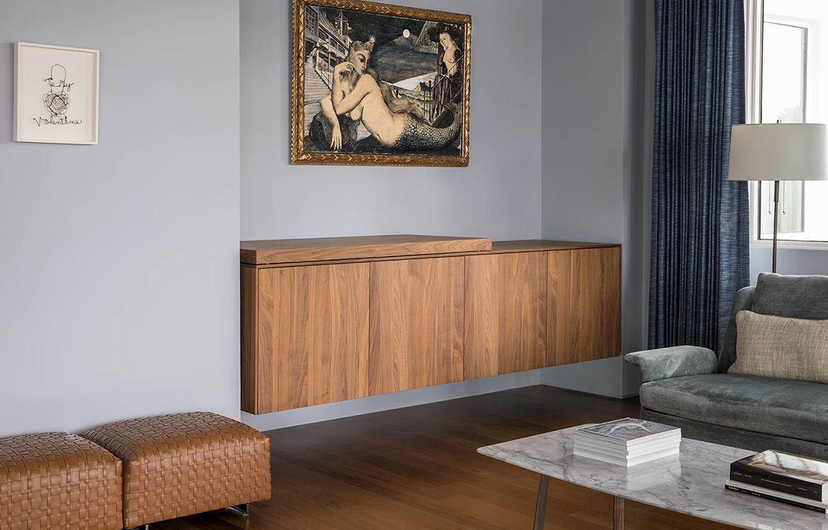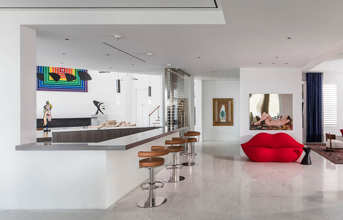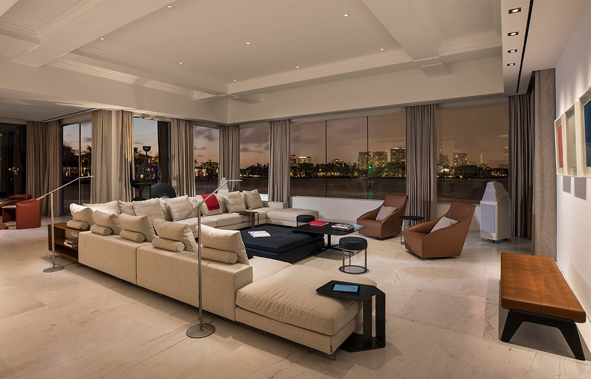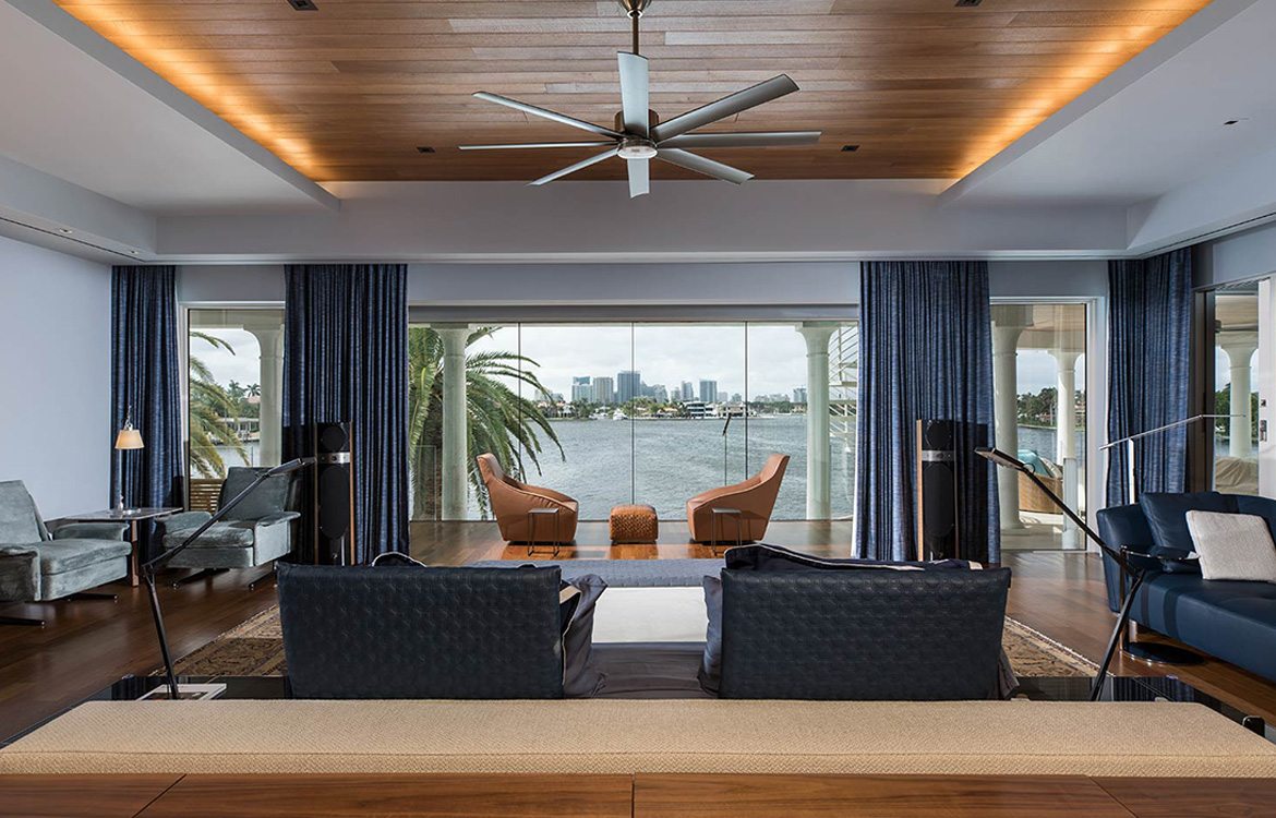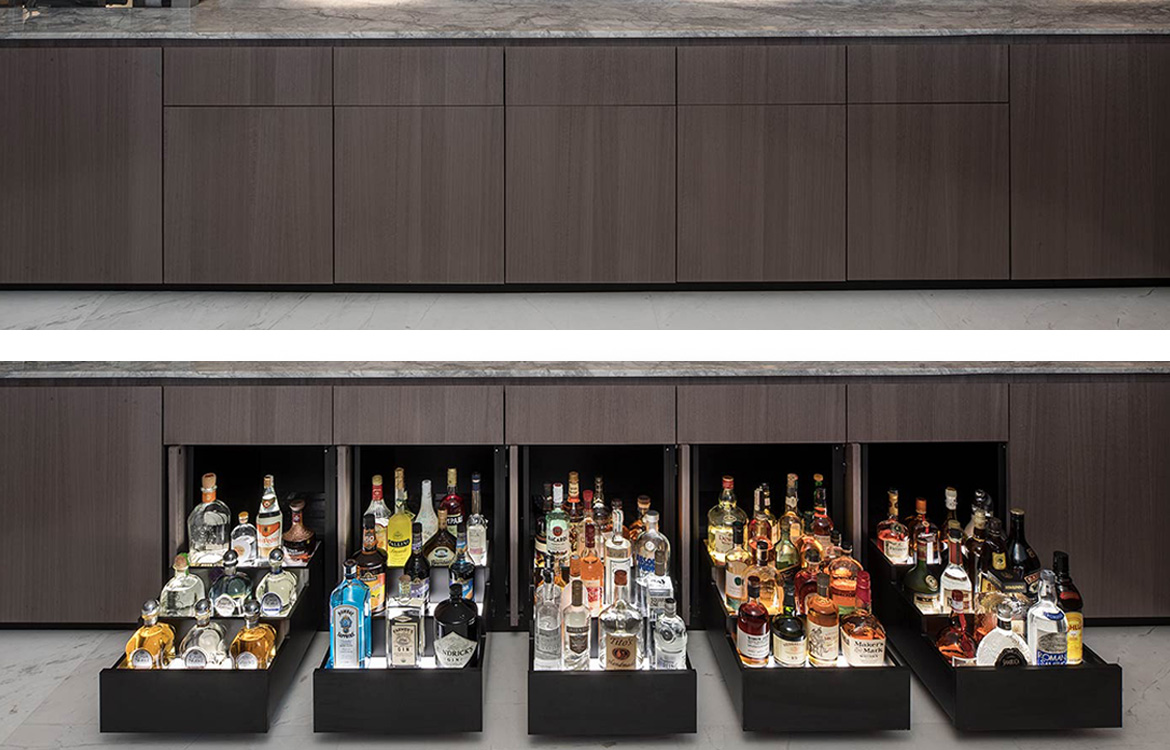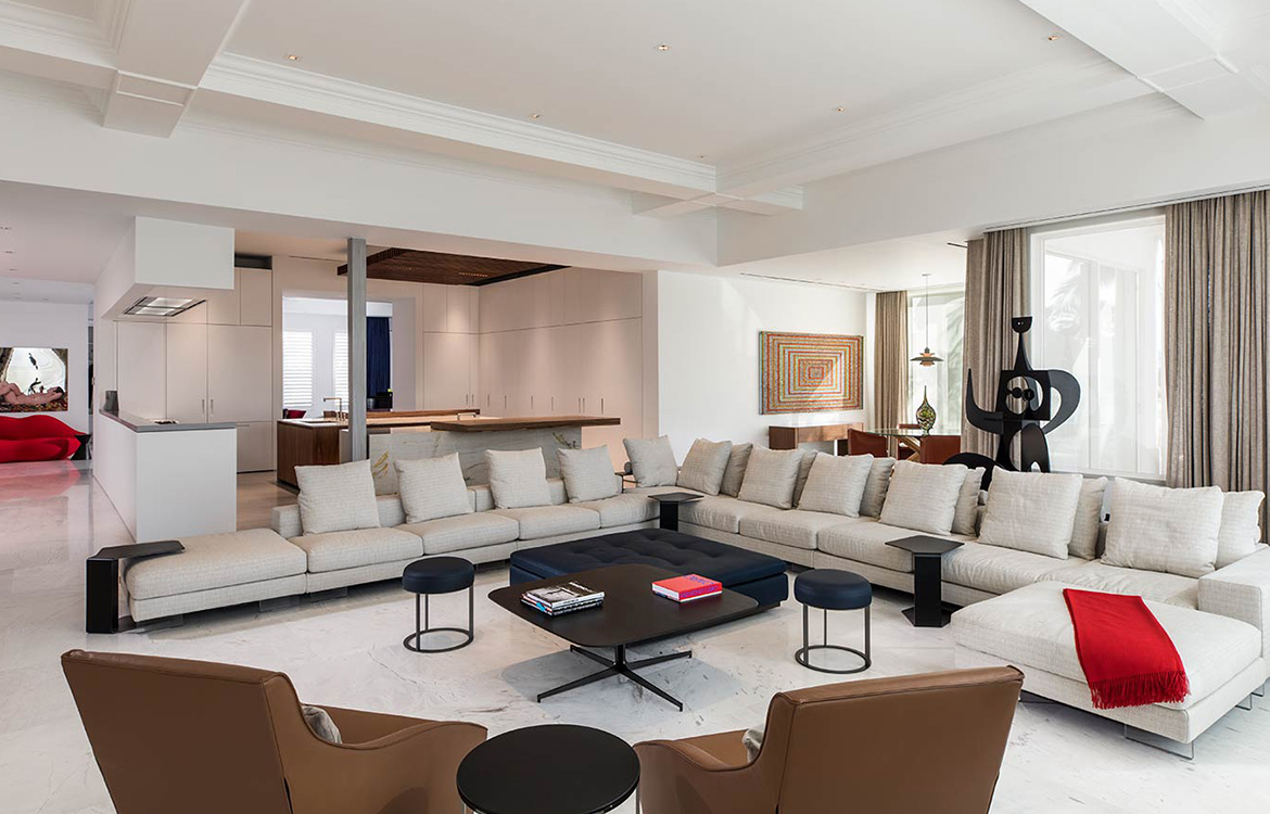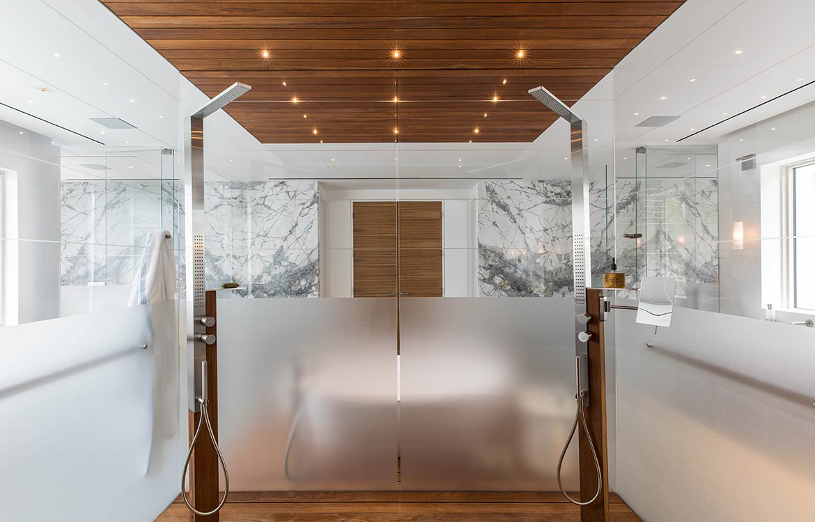 For the renovation of this seafront villa in Florida, Canova made elegant custom kitchens with top and sliding countertop in precious rosewood veneer finish, tall units with retractable doors in white matte lacquer, bathrooms cabinets in teak, a master bedroom coffee station with sliding top in walnut and an under lit bar in painted eucalyptus. Contemporary plumbing fixtures in marine grade stainless steel by CEA Design distributed by Canova.
